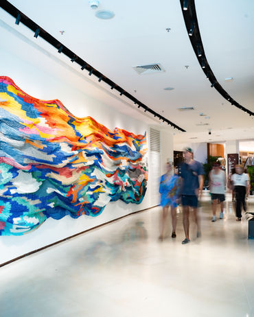As cores desse imenso mural trançado por mãos humanas sugerem um mapa, uma topografia e até, talvez, um mapeamento climático, com áreas mais frias e mais quentes. Mas, também, podem ser as águas que se rebelaram por fazermos delas um mar de sacolas plásticas. Zilah Garcia cria uma obra de arte têxtil a partir do que ignoramos na paisagem, todos os dias, apesar de ser tão devastador. O trançar das sacolas é também o trançar de nós mesmos, uns aos outros, à água, à terra e, infelizmente, ao plástico, se assim continuarmos – ou podemos reinventar e reciclar os nossos gestos e olhares.